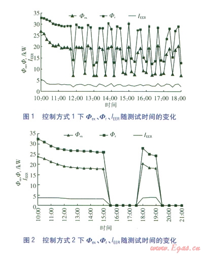 兩種控制方式下Фex、Фr、IEER隨測試時間的變化分別見圖1、2。對于控制方式1,由于測試期間Фex、Фr的變化趨勢大致相同,在不影響計算結(jié)果的前提下,圖1只給出10:00—18:00的測試數(shù)據(jù)。