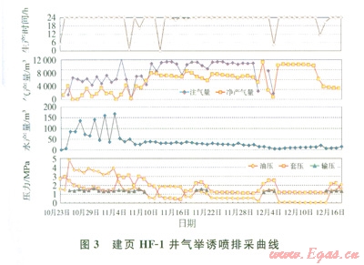 氣舉方式主要有正舉和反舉。通過(guò)對(duì)建頁(yè)HF-l井的分析可看出,采用套管氣舉方式均比油管氣舉效果較好,產(chǎn)量較高且?guī)€(wěn)定。但考慮氣井實(shí)際情況(外輸壓力為1.25 MPa),且與產(chǎn)量線性關(guān)系較好,則優(yōu)選套管氣舉方式進(jìn)行排水采氣,即輸壓l.25~1.39MPa,產(chǎn)氣量為4 000~5
