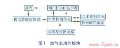 我公司研發(fā)的燃?xì)獗砉δ苣K組成見(jiàn)圖1。中央控制單元是該燃?xì)獗淼暮诵摹Mㄟ^(guò)Ic卡讀寫(xiě)單元,使用異常流量參數(shù)IC設(shè)置卡或無(wú)線形式將燃?xì)猱惓A髁繀?shù)傳入燃?xì)獗淼闹醒肟刂茊卧?,通過(guò)中央控制單元保存到數(shù)據(jù)儲(chǔ)存單元中,作為異常流量的判斷依據(jù)。當(dāng)前的瞬時(shí)流量數(shù)據(jù)從基表通過(guò)機(jī)電轉(zhuǎn)換傳感器讀入到中央控制單元后,由中央控制單元計(jì)算出當(dāng)前表內(nèi)的瞬時(shí)流量值并與數(shù)據(jù)儲(chǔ)存單元中的異常流量參數(shù)范圍進(jìn)行比較。當(dāng)確認(rèn)流量異常時(shí),中央控制單元發(fā)出關(guān)閥操作信號(hào)給閥門(mén),閥門(mén)關(guān)閉,同時(shí)向顯示器輸出異常流量信號(hào),顯示器顯示異常提示[1]。