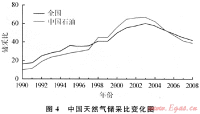 中國的天然氣儲(chǔ)采比在1990年僅為16,后來持續(xù)增長,1998年儲(chǔ)采比首次突破40(為42),2003年達(dá)到最高值(為61,見圖4),隨后因年產(chǎn)量增加而略有下降,2008年為42。中國石油的儲(chǔ)采比從1990年的10增至2003年的67,達(dá)到高峰,隨后下降至2008年的39。2008年中國石化的儲(chǔ)采比為75,中國海油為33。從目前的儲(chǔ)采比來看,中國天然氣產(chǎn)量快速增長具有較好的儲(chǔ)量基礎(chǔ)。