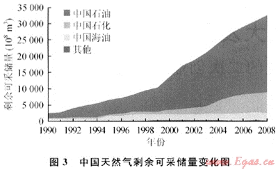 天然氣儲(chǔ)量進(jìn)入新的增長高峰期。自2000年起,中國平均每年新增天然氣可采儲(chǔ)量3018億立方米,其中中國石油年均新增2238億立方米,占全國平均新增可采儲(chǔ)量的74%(圖2)。截至2008年底,中國累計(jì)探明天然氣可采儲(chǔ)量3.9萬億立方米。白1999年起,中國的天然氣剩余可采儲(chǔ)量快速增長,從1萬億立方米增至2008年的3.2萬億立方米,增長了2.2倍。截至2008年底,中國石油的剩余可采儲(chǔ)量占全國的74%(圖3)。天然氣儲(chǔ)量的高速增長支撐了全國天然氣產(chǎn)量的快速提高。