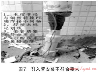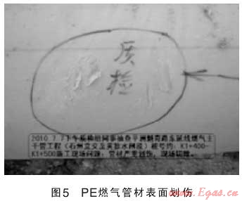 在燃?xì)夤艿朗┕み^(guò)程中,因施工單位人員、現(xiàn)場(chǎng)監(jiān)理人員以及建設(shè)單位現(xiàn)場(chǎng)管理人員對(duì)燃?xì)夤艿腊惭b施工質(zhì)量監(jiān)管不到位,施工經(jīng)驗(yàn)不足或者根本不懂燃?xì)夤艿朗┕さ闹匾裕话凑杖細(xì)庑袠I(yè)國(guó)家規(guī)范和行業(yè)標(biāo)準(zhǔn)嚴(yán)格操作和監(jiān)管,產(chǎn)生一系列施工質(zhì)量隱患。如鋼管防腐處理不到位、閥井內(nèi)波紋補(bǔ)償器受外力安裝偏斜或不同軸,電熔管件焊接焊口冷卻采取沖水冷卻方式,PE管道運(yùn)輸、搬運(yùn)造成管壁劃傷嚴(yán)重超標(biāo)等人為因素,給城市燃?xì)夤艿腊踩\(yùn)行種下了一顆顆定時(shí)炸彈(如圖3、4、5)。