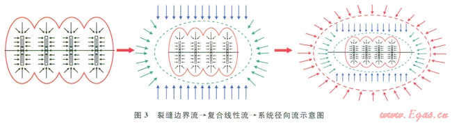 裂縫邊界流之后,壓力擾動將逐漸覆蓋儲層有效壓裂體積的整個范圍,并進(jìn)入復(fù)合線性流,其特征如同氣體流入一條大的裂縫。該流態(tài)不是一個單純的線性流,而是垂直于水平井筒的線性流為主導(dǎo),水平井段兩端的流線則成橢圓形,兩端的橢圓流的效應(yīng)小于垂直水平井筒的線性流。
