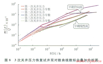 此后出現(xiàn)了徑向流階段(壓力導(dǎo)數(shù)曲線接近水平)。對于出現(xiàn)的線性流和徑向流,筆者認(rèn)為應(yīng)該是早期線性流和早期徑向流。