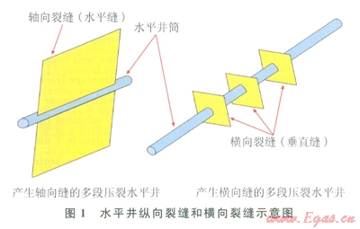 通常水平井分段壓裂裂縫存在2種極限情況:縱向和橫向(圖1)。當(dāng)水平井井筒方位與最大水平主應(yīng)力方位垂直時,可產(chǎn)生橫向裂縫;當(dāng)兩者方位一致時,可產(chǎn)生軸向裂縫(縱向裂縫);當(dāng)兩者夾角處于其他情況時,裂縫形態(tài)會非常復(fù)雜。由于水平井軸向裂縫有效泄流面積相對橫向裂縫來說小很多,一般希望水平井壓裂產(chǎn)生橫向裂縫作為裂縫網(wǎng)絡(luò)的主裂縫。頁巖氣井最佳的壓裂效果是產(chǎn)生垂直于水平井段的橫向主裂縫的同時,產(chǎn)生垂直于橫向裂縫的二級裂縫,以提高裂縫與地層的接觸面積,有利于頁巖氣的解吸附和氣體在儲層中的流動。據(jù)統(tǒng)計,水平井分段壓裂的裂縫以橫向裂縫為主[3-5]。