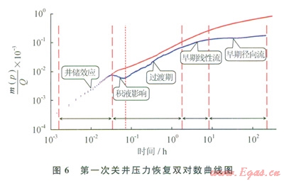 第一次關(guān)井(關(guān)井時間為30d)壓力恢復(fù)雙對數(shù)圖如圖6所示。