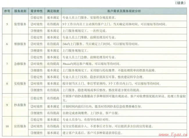 現(xiàn)有管道燃?xì)夥?wù)分類包括:供氣服務(wù)、營業(yè)服務(wù)、量管服務(wù)、裝管服務(wù)、點(diǎn)火服務(wù)、安檢服務(wù)、抄表服務(wù)、安全宣傳、急修服務(wù)、維修服務(wù)l0大類。