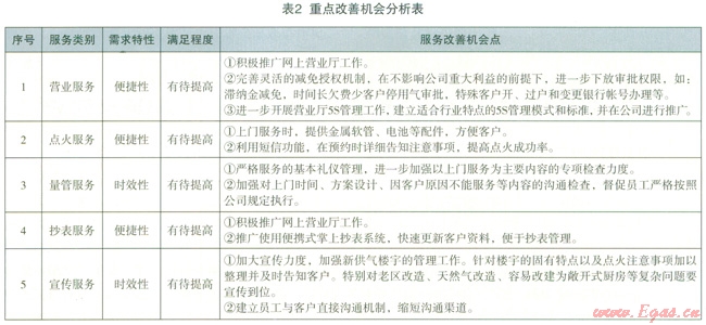 以客戶需求分析為導(dǎo)向的服務(wù)改善促進(jìn)機(jī)制,是通過卡諾模型和三環(huán)六步法等管理工具,細(xì)分客戶需求,結(jié)合企業(yè)服務(wù)現(xiàn)狀,尋找服務(wù)改善機(jī)會,足以客戶需求為導(dǎo)向的管理理論與公司實(shí)際業(yè)務(wù)相結(jié)合的重要環(huán)節(jié),也是制定全年的重點(diǎn)服務(wù)工作和過程改進(jìn)體系的重要參考依據(jù)。“客戶需求分析”和“服務(wù)改善促進(jìn)機(jī)制”是以客戶需求為導(dǎo)向的管道燃?xì)鈨?yōu)質(zhì)服務(wù)模式從理論探索邁向?qū)嵺`的重要內(nèi)容和標(biāo)志。