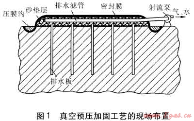 在采用真空預(yù)壓加固軟土地基時(shí),在密封膜上不施加重物,而把大氣作為荷載。在抽氣時(shí),土體孔隙中的氣體首先被抽出,使密封膜緊貼于砂墊層上。砂墊層中形成的負(fù)壓,通過(guò)排水板逐漸向下延伸,并由排水板向其周圍土體傳遞,引起土體中孔隙水壓力降低,從而使土體孔隙中的水由土體向排水板滲流,最后匯至砂墊層中被射流泵排出。淺層真空預(yù)壓加固與深層真空預(yù)壓加固工藝的主要區(qū)別在于,前者采用編織布、無(wú)紡?fù)凉げ嫉忍娲皦|層,以及排水濾管的布置方式不同。真空預(yù)壓加固工藝的現(xiàn)場(chǎng)布置見(jiàn)圖1。