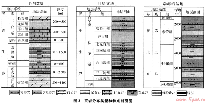 古生代結(jié)束以來,全球性的區(qū)域板塊運(yùn)動(dòng)導(dǎo)致亞洲大陸發(fā)生碰撞作用并經(jīng)受了強(qiáng)烈的擠壓作用[9~10],在各板塊拼合并導(dǎo)致海水區(qū)域性退出的同時(shí),使得古生界海相頁巖地層經(jīng)受了強(qiáng)烈改造、擠壓變形或隆升剝蝕,在揚(yáng)子地區(qū)普遍形成了大面積暴露及近地表埋藏的古生界頁巖。而在構(gòu)造相對(duì)穩(wěn)定的華北、塔里木等地臺(tái)區(qū),構(gòu)造保存條件相對(duì)較好,目前仍有埋深不等的多套較大厚度的海相頁巖地層分布。不同有機(jī)質(zhì)條件、埋藏深度和產(chǎn)烴能力的黑色頁巖分別可能成為其他層位油氣富集的烴源巖、可能具有原地“成藏”特點(diǎn)[11~12]頁巖氣的物質(zhì)基礎(chǔ)或者兩種可能;進(jìn)入中生代,陸相沉積逐漸成為主體,主要在中國北方地區(qū)形成了區(qū)域分布的三疊系(如鄂爾多斯盆地等,也包括川西[13~15])、侏羅系(如準(zhǔn)噶爾[16]、吐哈等盆地)及白堊系(如松遼[17]、海拉爾等盆地)湖相暗色泥頁巖。雖然新生代的差異性構(gòu)造運(yùn)動(dòng)導(dǎo)致了部分地層的裸露剝蝕,但目前仍有大規(guī)模的殘留保存和區(qū)域分布,結(jié)果導(dǎo)致產(chǎn)生了不同地質(zhì)時(shí)代、埋藏深度和熱演化程度泥頁巖的同時(shí)發(fā)育。對(duì)于抬升幅度較大、保存條件較差的富含有機(jī)質(zhì)泥頁巖,雖然它們已不再適合作為常規(guī)天然氣圈閉的源巖基礎(chǔ),但仍有可能是頁巖氣資源富集的潛在目標(biāo);與古生界和中生界泥頁巖的多期作用特點(diǎn)不同,新生界泥頁巖主要發(fā)育在保存條件較好的盆地區(qū)域內(nèi)[18]。由于其他層系天然氣的聚集需要首先滿足其自身對(duì)天然氣聚集的需要,故常規(guī)油氣地質(zhì)分析中的氣源巖(泥頁巖)將有可能同時(shí)成為頁巖氣勘探的新對(duì)象。