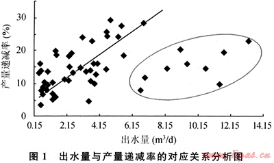 出水增大儲層內(nèi)滲流阻力和井筒壓力損耗,影響氣井的產(chǎn)能(圖1)。在氣井產(chǎn)能評價時,必須考慮出水對產(chǎn)能的影響。對一部分井進(jìn)行了不同開采階段的多次系統(tǒng)試井,產(chǎn)能方程研究表明,氣井的無阻流量隨氣井出水量的增加而降低。但同時由于地層能量下降、氣井出砂等因素也會降低氣井產(chǎn)能,僅根據(jù)目前系統(tǒng)試井測試數(shù)據(jù)還不能判斷出水對氣井產(chǎn)能的降低幅度。