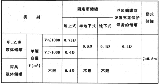注:1 D為相鄰較大立式儲罐的直徑(m),矩形儲罐的直徑為長邊與短邊之和的一半。