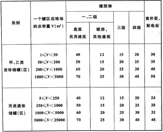 注:1 總?cè)萘坎淮笥?000m3的甲、乙類液體儲罐和總?cè)萘坎淮笥?000m3的丙類液體儲罐,其防火間距可按本表的規(guī)定減少25%。