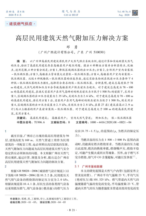 上述為廣州市高層民用建筑居民用戶天然氣供應系統(tǒng)為例,通過計算和實地測量天然氣的壓力,驗證了高層民用建筑存在高樓層用戶超壓問題。提出4種解決方案并分析其特點、優(yōu)缺點、適用范圍。