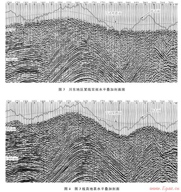 1) 該方案與第2種方法的區(qū)別在于動校正參考點(diǎn)放在了真正的地面,從而使動校正嚴(yán)格地遵循了地震波射線的傳播規(guī)律。