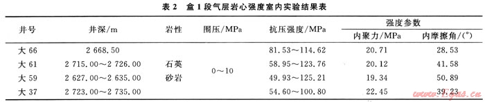 表2給出了盒1段氣層巖心強(qiáng)度室內(nèi)實(shí)驗(yàn)結(jié)果,從表2中可以看出在圍壓為10MPa時(shí),巖石的平均抗壓強(qiáng)度為116.8MPa,而通過模擬計(jì)算在氮?dú)饨橘|(zhì)下的井內(nèi)最大應(yīng)力為93.95MPa,因而不會出現(xiàn)井壁失穩(wěn)[7]。