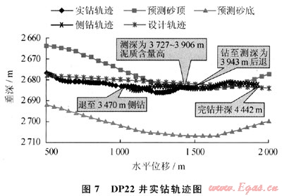 DP22井在水平段的氮?dú)馀菽菲胶忏@進(jìn)過程當(dāng)中實(shí)現(xiàn)了隨鉆點(diǎn)火,火焰高4~6m,后效火焰高9~11m,油氣顯示非?;钴S。DP22井在井深3727~3906m井段伽馬值偏高,判斷為鉆遇泥巖夾層,后退至3470m處進(jìn)行懸空下切側(cè)鉆,后鉆至井深4442m處完鉆,由于后退下切側(cè)鉆導(dǎo)致氮?dú)馀菽瓕?shí)鉆進(jìn)尺超過1900m。在最后一趟鉆起鉆過程中出現(xiàn)了卡鉆事故。事故原因?yàn)槌辽晨ㄣ@,最后一趟鉆總進(jìn)尺為281.54m,平均機(jī)械鉆速為11.04m/h,在鉆井過程中伽馬值偏高,同時(shí)出口處沒有巖屑返出。圖7給出了DP22井氮?dú)馀菽菲胶馑蕉螌?shí)鉆軌跡。