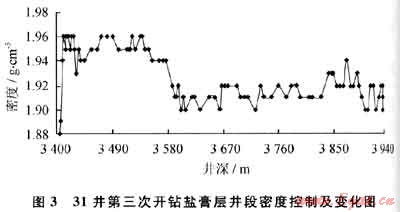 圖3所示為2010年3月31井在第三次開鉆鹽膏層井段(3400~3937m)的密度控制情況。31井第三次開鉆鹽膏層井段初鉆時密度控制在1.95g/cm3左右,進入井深3580m后根據(jù)實際情況逐步降低了鉆井液密度,合理、適當(dāng)?shù)恼{(diào)整密度范圍以達到“近平衡鉆井”,不僅給鉆井液日常維護帶來了便利,而且明顯提高了鉆井速度、縮短了鉆井周期(第三次開鉆鹽膏層用時僅30d),很好地實現(xiàn)了快速、安全、高效的鉆井目標(biāo)。