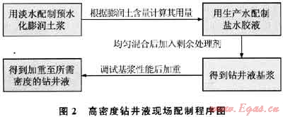 室內(nèi)試驗和現(xiàn)場應(yīng)用都表明:要得到性能穩(wěn)定、使用周期長的高密度飽和鹽水聚磺鉆井液,現(xiàn)場配制時首先必須遵循一定的配制程序(圖2)。