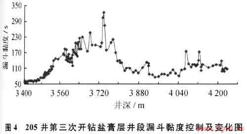 將“護膠為主、降黏為輔”作為調(diào)控各項性能的指導(dǎo)原則;適當(dāng)降低井漿中的膨潤土含量,以降低其發(fā)生各種污染的可能性。高密度飽和鹽水鉆井液由于其密度高、固相含量大,體系本身所固有的固相容量限已被壓縮至一個很窄的范圍,一旦進入體系的劣質(zhì)固相(如鉆屑粉末、泥巖細顆粒等)來不及清除,累積到一定程度若其超過體系固相容量上限時,各種固相粒子極易連接形成結(jié)構(gòu),導(dǎo)致鉆井液的黏度和切力增加,從而也會以污染形式表現(xiàn)出來[3~5]。如2009年3月205井在第三次開鉆鹽膏層井段(3402~4237m)鉆進過程中所發(fā)生的情況(圖4)就是如此,具體表現(xiàn)為鉆井液“黏土固相侵”,黏切劇增,流變性能失穩(wěn)。