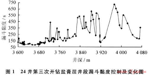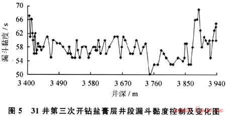 采取的具體措施包括:維持體系較低的堿性(即pH值一般保持在8~9);適當(dāng)放大量以膠液形式補充各類處理劑進入體系以維護鉆進過程中材料的正常消耗;在井漿中不斷補充NaCl甚至到飽和以提高其整體抑制性;補充KCl至一定量以形成對黏土質(zhì)成分應(yīng)有的抑制效果等。圖5為31井第三次開鉆鹽膏層井段漏斗黏度控制及變化情況,由于加強了對鉆井液整體抑制性的維護,鉆井液流變性能明顯較好。