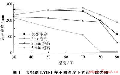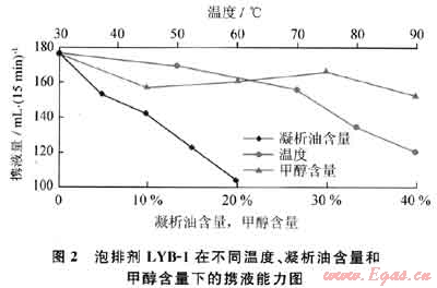 通常溫度升高,泡排劑溶液的黏度降低,泡沫易破裂,致使泡沫起泡能力和攜液能力變差。為了評價該泡排劑的耐溫能力,用地層水配制0.5%泡排劑溶液,測定了該泡排劑在不同溫度下的起泡能力和攜液能力(圖1)。