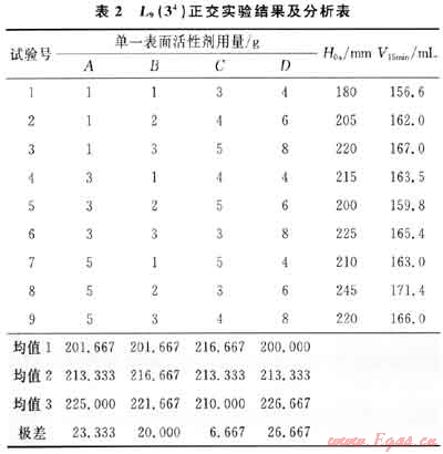 從表2可知,泡沫的攜液量都在150mL以上,其攜液能力(攜液能力=泡沫攜帶出的液體體積/總泡排劑溶液的體積×100%)[3]都在75%以上。因此,以起始泡高(0s)為考察指標(biāo)進(jìn)行分析,樣品L-2(D)是影響實驗結(jié)果的最主要因素,單一表面活性劑L-1(A)。甜菜堿(B)和銨鹽(C)次之,最佳因素水平組合為A3B3C1D3。由于該配比不在原設(shè)計的試驗方案中,為驗證該配比的真實性,以該配比進(jìn)行起泡能力和攜液能力的測定,結(jié)果測得該配比的起始泡高度為265mm,攜液量為176.5mL。與表2中的8號試驗結(jié)果相比,可證明該配比是9次試驗中最優(yōu)的。因此通過正交設(shè)計實驗確定泡排劑LYB-1的最佳質(zhì)量配比為L-1(A):甜菜堿(B):銨鹽(C):L-2(D)=5:3:3:8。