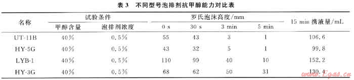 為了充分說明泡排劑LYB-1具有較強的抗甲醇能力,30℃時將該泡排劑與現(xiàn)場應(yīng)用較多的泡排劑UT-118、HY-5G和HY-3G進(jìn)行了對比,試驗結(jié)果見表3。表3數(shù)據(jù)表明,泡排劑LYB-1具有較強的抗甲醇能力,明顯優(yōu)于其他3種泡排劑。