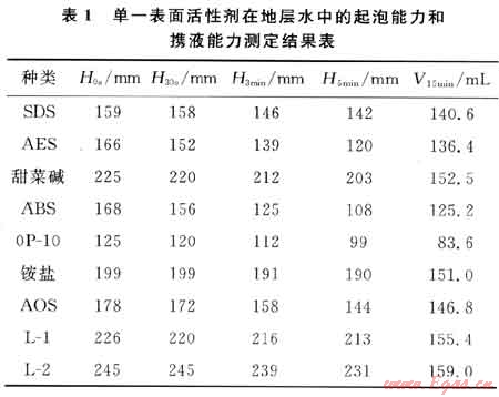 為了研究單一表面活性劑對地層水的起泡能力和攜液能力,用傾注法測定了室內(nèi)自制表面活性劑L-1和L-2以及市面銷售的表面活性劑十二烷基本磺酸鈉(ABS)、α-烯基磺酸鈉(AOS)、脂肪醇聚氧乙烯醚硫酸鹽(AES)、十二烷基磺酸鈉(SDS)、辛基酚聚氧乙烯10醚(OP-10)、甜菜堿和銨鹽的起泡能力和攜液能力,并記錄了0s、30s、3min和5min的泡沫高度及15min的泡沫攜液量(表1)。實驗泡排劑溶液濃度為0.5%,總液體量為200mL,地層水礦化度為4.7×104mg/L,水型為CaCl2型,實驗溫度為30℃。
