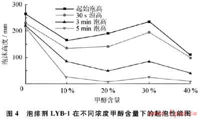 4) 該泡排劑與現(xiàn)場應(yīng)用較多的UT-11B、HY-5G和HY-3G泡排劑進(jìn)行了抗甲醇能力對比,結(jié)果表明該泡排劑具有較強的抗甲醇能力,明顯優(yōu)于其他3種泡排劑。