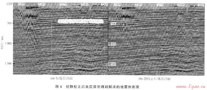 三湖地區(qū)地表相對平坦,以往該區(qū)資料處理采用高程靜校正,導(dǎo)致在很多近地表異常地區(qū)地面資料較差。通過近兩年的研究,認(rèn)識到該區(qū)的速帶變化劇烈,存在較多的局部低降速帶異常。對靜校正方法的分析,最終確定了適合本區(qū)法——折射靜校正方法?;谀P图s束的折射靜方法能提供高質(zhì)量的中、長波長分量,同時,其短靜校正精度也較高。在實際靜校正工作中,主要了以下技術(shù)要點:①通過詳細(xì)的近地表結(jié)構(gòu)的整剖,準(zhǔn)確建立近地表模型,為折射靜校正提供了合模型約束參數(shù);②通過對湖區(qū)、鹽堿地、鹽堿沼澤層含氣區(qū)等表層結(jié)構(gòu)對大炮初至質(zhì)量影響較大區(qū),采用處理手段提高初至質(zhì)量,提高了折射靜枝這些區(qū)域的應(yīng)用精度;③通過提高折射波的識別、的折射分層、消除排列邊界效應(yīng)的延遲時延拓,劉析反演模型,確定合理的靜校正計算標(biāo)志層,最大地解決了該區(qū)存在的靜校正問題,消除了一些表常的影響(圖4)。
