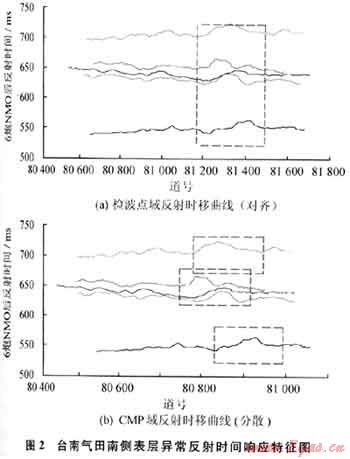 研究結(jié)果表明,不同位置單炮對于某一反射界面,表層異常和地下含氣異常的反射時間響應(yīng)在檢波點域和CMP域是正好相反的。在檢波點域里,表層異常導(dǎo)致的反射時移是對齊的,在CMP域里是分散的;對于地下含氣異常,在檢波點域里,含氣異常導(dǎo)致的反射時移是分散的,在CMP域里是對齊的。實際資料應(yīng)用表明(圖2),利用反射時間法識別表層異常與含氣異常是可行的,從而為甄別該區(qū)域的表層結(jié)構(gòu)異常提供了一種新的思路和方法。