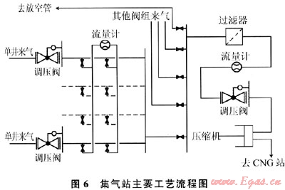 40口先導(dǎo)性試驗項目井中,在氣田內(nèi)建設(shè)集氣站,增壓到0.6MPa后經(jīng)過外輸管道輸送到CNG加氣站,通過CNG罐車外銷。由于集氣站建設(shè)在氣田內(nèi),所以集氣站內(nèi)建設(shè)有1個閥組,氣體進入閥組后,首先調(diào)壓,壓力調(diào)整為0.2MPa,單井產(chǎn)氣可利用閥門倒換流程進行單井輪換計量。集氣站閥組產(chǎn)氣和其他閥組來氣在匯管進行匯合,經(jīng)過過濾分離、總計量和調(diào)壓后進入集氣站壓縮機增壓,壓力增加到0.6MPa后,進入外輸管道,送往CNG站。該集氣站主要流程如圖6所示。