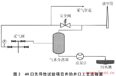 40口先導(dǎo)性試驗項目井的井口流程中,煤層氣從井口套管中產(chǎn)出,然后進入采氣管道,往閥組匯集。采氣管道前裝有安全閥,采氣管道壓力達到0.4MPa后,安全閥跳起,超壓氣體進入放空管放空,避免系統(tǒng)超壓而產(chǎn)生危險。產(chǎn)出水從油管中產(chǎn)出,首先經(jīng)過氣水分離器進行分離,分離出來的氣體由放空管進行放空,分離后產(chǎn)出水進行流量計量,然后排放到井口污水池。該井口工藝流程如圖2所示。