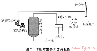 在分離器的入口管道上設(shè)有緊急關(guān)斷閥和緊急放空閥,當(dāng)出現(xiàn)事故時立即關(guān)閉緊急關(guān)斷閥,同時打開緊急放空閥,使煤層氣進入放空系統(tǒng)。當(dāng)壓縮機的進氣量不能滿足壓縮機進氣要求時,打開壓縮機的旁通閥,使壓縮機的出口煤層氣回流至壓縮機入口,進行流量調(diào)節(jié)。壓縮機組的進口匯管設(shè)有調(diào)壓放空系統(tǒng),壓縮機事故停機時,導(dǎo)致壓縮機入口壓力增高,通過調(diào)壓放空閥將超壓部分的煤層氣及時放空去放空系統(tǒng),從而保持其他壓縮機組的正常運行。該增壓站主要工藝流程如圖7所示。
