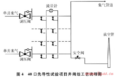 40口先導(dǎo)性試驗項目井中,氣體進入閥組后,首先經(jīng)過調(diào)壓閥調(diào)壓,壓力調(diào)整為0.2MPa,單井產(chǎn)氣可利用閥門倒換流程,進行單井產(chǎn)氣輪換計量。所有氣體匯集到生產(chǎn)匯管后進入集氣管道,輸至集氣站。在生產(chǎn)匯管上安裝有安全閥,當(dāng)壓力超過0.4MPa時,安全閥自動跳起。閥組中單井流量數(shù)據(jù)通過光纜傳輸至監(jiān)控中心。該工藝流程如圖4所示。