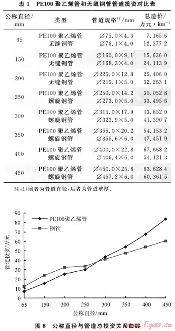將表1中數(shù)據(jù)繪制成管徑與管線總投資關(guān)系曲線如圖8所示。由圖8可知,當(dāng)采氣、集氣管道的公稱直徑不大于200mm時,采用PE100聚乙烯管道投資低。當(dāng)采氣、集氣管道的公稱直徑大于200mm時,采用鋼制管道投資低。該示范工程施工中采用了PE100聚乙烯管道與鋼管相結(jié)合的方案,采氣管道和部分集氣管道采用了PE100聚乙烯管道,明顯降低了工程管道的投資。