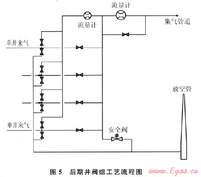 后期施工井的閥組取消了調(diào)壓閥,井口來的煤層氣到達集氣閥組后,進入集氣閥組的生產(chǎn)匯管,經(jīng)總計量后直接進入管道,整個集氣系統(tǒng)從井口到增壓站為1個封閉系統(tǒng),集輸壓力通過系統(tǒng)自動調(diào)整平衡。單井煤層氣計量時,首先進入計量匯管,經(jīng)流量計計量后,再進入生產(chǎn)匯管。每口井的采氣管道在集氣閥組都有放空流程,當(dāng)采氣管道檢修時,打開放空閥,進入放空匯管,經(jīng)放空管放空。生產(chǎn)閥組匯管上設(shè)有安全閥,當(dāng)采、集氣管道壓力達到0.4MPa時安全閥起跳,將超壓部分氣體排放至放空管。該閥組工藝流程如圖5所示。