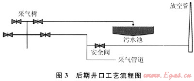 在該段流程中,水通過抽油機從油管中抽出,直接排放到井場附近的排污池,自然蒸發(fā)。煤層氣從套管和油管間的環(huán)形空間產(chǎn)出,通過采氣管道,進入煤層氣采集系統(tǒng),系統(tǒng)壓力為0.2MPa。當(dāng)采氣系統(tǒng)檢修時,打開放空閥,通過放空管把井口里的煤層氣連續(xù)排放到大氣中。該井口工藝流程及如圖3所示。