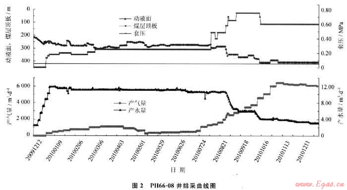 進(jìn)入穩(wěn)定生產(chǎn)階段后,宜采用定產(chǎn)排采制度,此階段應(yīng)避免單井產(chǎn)氣量的大幅度波動(dòng)。需要進(jìn)行單井產(chǎn)量調(diào)節(jié)時(shí),一般通過調(diào)整動(dòng)液面及套壓進(jìn)行產(chǎn)量調(diào)節(jié),主要分兩種情況:①動(dòng)液面較高的井,主要通過增加抽油機(jī)沖程沖次或提高管式泵泵效的方法,通過降低動(dòng)液面來降低井底流壓,達(dá)到提產(chǎn)的目的;②動(dòng)液面接近煤層頂板的井,一般通過調(diào)整套壓調(diào)整井底流壓,調(diào)壓時(shí)一般單日內(nèi)套壓變化不超過0.2MPa。