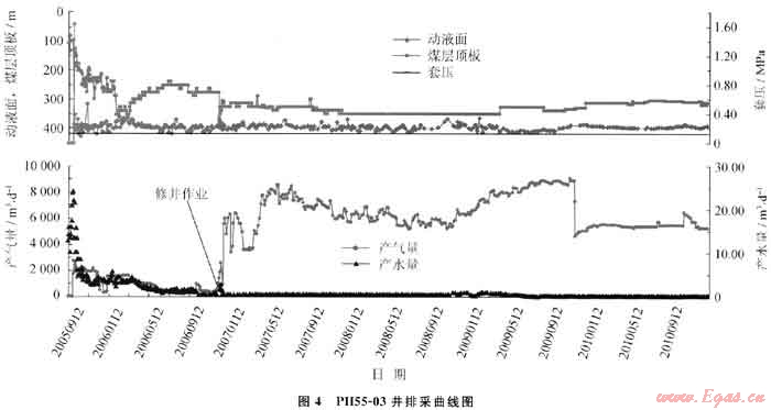 在對(duì)煤層氣井產(chǎn)出機(jī)理、煤層氣井不同階段生產(chǎn)特征研究分析的基礎(chǔ)上,總結(jié)出一套穩(wěn)控精細(xì)排采技術(shù)。該技術(shù)的主要特點(diǎn)是:避免煤層傷害,平穩(wěn)排水降壓,擴(kuò)大壓降范圍,逐步提高產(chǎn)量。正是由于穩(wěn)控精細(xì)排采技術(shù)的實(shí)施,保證了本區(qū)煤層氣生產(chǎn)的成功。