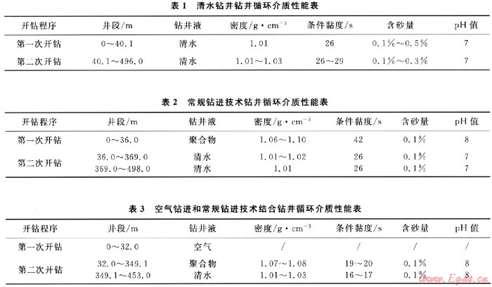 示范區(qū)內(nèi)部分井在出水點(diǎn)以上地層利用高壓空氣和泡沫劑作為循環(huán)介質(zhì),有效提高了鉆進(jìn)效率。隨著井內(nèi)出水量不斷增大,采用清水作為循環(huán)介質(zhì)鉆進(jìn),圓滿完成了施工任務(wù)。