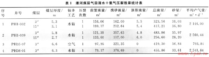 潘河煤層氣田共鉆井150口,其中的147口井進行了壓裂增產改造,改造類型包括活性水加砂壓裂、氮氣泡沫壓裂、清水+氮氣壓裂、清水壓裂。36口井采用活性水攜砂壓裂技術;2口井(PH1和PH1-006井)采用氮氣泡沫壓裂技術,4口井采用清水+氮氣壓裂技術,107口井采用清水加砂壓裂技術。其中PH1-002和PH1-009的30、15#煤層分別采用了不同的壓裂技術。