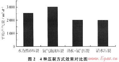 采用4種壓裂方式的壓裂效果對比如圖2所示。從圖2中可以看出:氮氣泡沫壓裂效果最好,壓裂井的平均產氣量為3 037.47m3/d;其次是活性水加砂壓裂壓裂的井,平均產氣量為2540.77m3/d;清水+氮氣壓裂、清水加砂壓裂效果相差不大,分別為2010.53m3/d和1998.88m3/d。