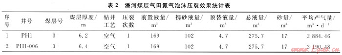 潘河煤層氣田采用氮氣泡沫壓裂的2口井均已投入排采并產氣,其統(tǒng)計數(shù)據(jù)如表2所示。根據(jù)統(tǒng)計,2口井采用氮氣泡沫壓裂后平均產氣量為3037.47m3/d,增產效果顯著。