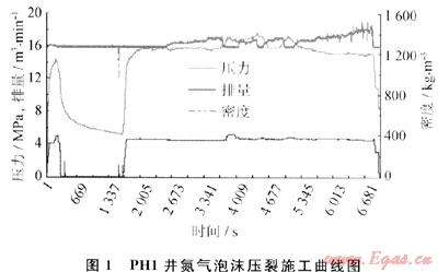 潘河示范工程項目采用研制的泡沫壓裂液進行2口井的氮氣泡沫壓裂,圖1為PH1井的氮氣泡沫壓裂施工曲線圖。