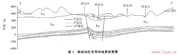 韓城地區(qū)隸屬于陜西省渭南市,地處關(guān)中平原的東北側(cè)。構(gòu)造上位于鄂爾多斯盆地渭北隆起的東南緣,東面以黃河和韓城大斷裂為界,南臨渭河地塹,西南與澄臺礦區(qū)毗鄰,面積約為1500km2。研究區(qū)構(gòu)造活動平穩(wěn),區(qū)域上由南向北、由東向西逐漸變?nèi)酰话氵厹\部相對于中深部復(fù)雜。北部以擠壓構(gòu)造變形為主,呈北東南西向;南部主要為拉伸構(gòu)造變形,有2個主導(dǎo)方向,即北東南西向和東西向,總體構(gòu)造形態(tài)是一個傾向北西的具波狀起伏的緩斜大型單斜構(gòu)造(圖1)。韓城地區(qū)主力產(chǎn)氣煤層分別為山西組3t煤層和太原組5#、11#煤層。山西組為陸相沉積,主要為河流沖積 三角洲沉積體系;太原組為海陸交互相沉積,主要為海灣一漏湖沉積體系。煤系地層基底為石炭系本溪組的鋁土質(zhì)泥巖[1~4]。