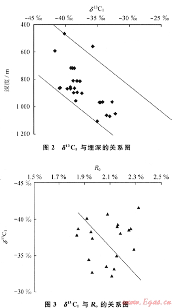 綜上所述,韓城地區(qū)煤層氣碳同位素具有以下幾個特征:①δ13C1分布穩(wěn)定,隨深度和Ro的增加而增大;②未發(fā)現(xiàn)生物氣存在的特征;③乙烷碳同位素值偏重,推測是高變質(zhì)煤化作用的結(jié)果;④δ13C1具有偏輕的特點。