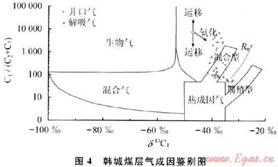 國內(nèi)外學(xué)者都提出了多種煤層氣成因類型判別的圖版[16~17],多數(shù)是基于煤層氣組分和穩(wěn)定同位素的特征建立的,取得了較好的應(yīng)用效果。其中,Whiticar圖版是煤層氣成因判別的經(jīng)典圖版之一。為此,將韓城地區(qū)煤層氣的組成和同位素值數(shù)據(jù)在Whiticar判別圖版上成圖(圖4)。分析發(fā)現(xiàn)韓城煤層氣主要是熱成因氣,且存在經(jīng)過解吸一擴散作用效應(yīng)改造過的次生煤層氣,這與從地質(zhì)條件推測碳同位素變輕的原因基本一致。再者,乙烷碳同位素值偏重也是熱成因氣的一個重要證據(jù),是生物氣不具有的。韓城地區(qū)煤層熱演化程度處于貧煤和無煙煤(Ro介于1.9%~2.6%)階段,結(jié)合煤層氣演化過程和氣體地球化學(xué)特征分析,筆者認為韓城煤層氣的成因類型以熱降解氣為主且系經(jīng)過解吸-擴散效應(yīng)改造的次生熱成因氣。因此,應(yīng)以尋找熱成因氣為今后的煤層氣主要勘探目標(biāo)。