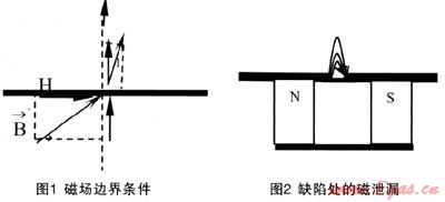 由上述理論可導出,當磁場由磁導率大的介質(zhì)穿出到磁導率小的介質(zhì)中時,磁場向法向發(fā)生偏轉(zhuǎn)。因此當磁場在管壁上遇到缺陷時由于μ2遠小于μ1。使得磁場在缺陷出溢出形成漏磁信號。